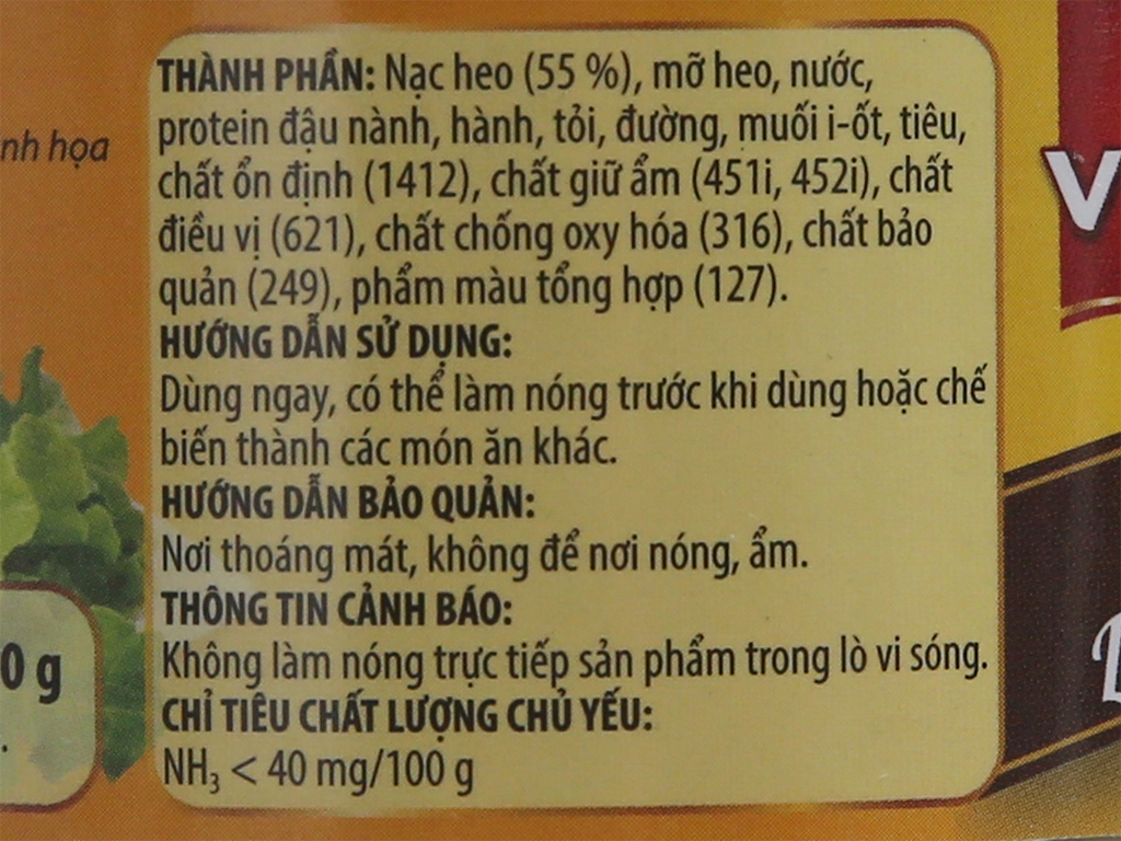 Thành phần: Nạc heo (55%), mỡ heo, tinh bột, protein đậu nành, đường, muối, tiêu, hành, tỏi, chất bảo quản (249), chất ổn định (452i), chất điều vị (621), màu thực phẩm tổng hợp (127)