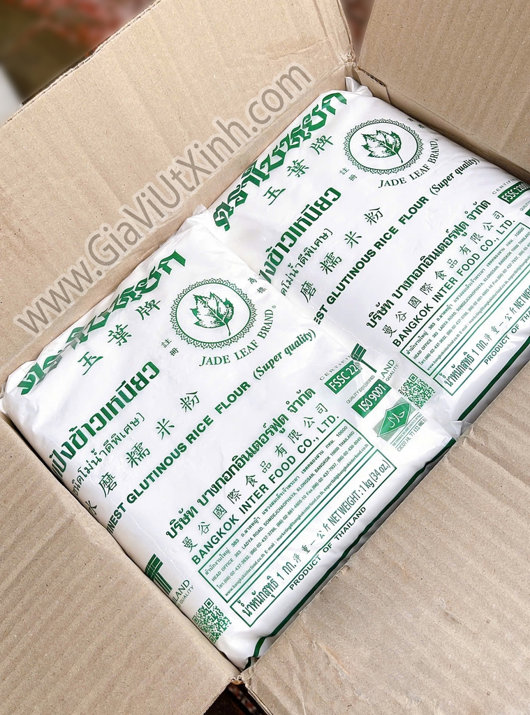 Sản phẩm Tinh Bột Nếp Thái Lan Chiếc Lá 1KG – Jade Leaf Brand là loại bột nếp nổi tiếng của Thái Lan, được nhiều cơ sở sản xuất, quán ăn và đơn vị kinh doanh lựa chọn nhờ độ mịn cao, màu bột đẹp, độ kết dính tốt và cho thành phẩm dẻo mềm rất ngon.